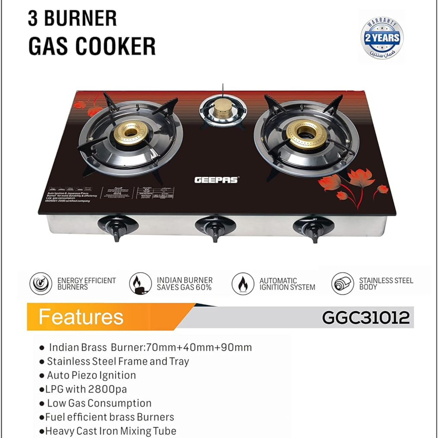 Take your cooking to the next level with the Geepas GGC31012 3-Burner Gas Cooker. Designed for efficiency and versatility, it features three burners of varying sizes (70mm, 40mm, and 90mm) to handle everything from simmering sauces to boiling large pots. Its durable stainless steel frame and automatic ignition system make it a perfect fit for any modern kitchen.