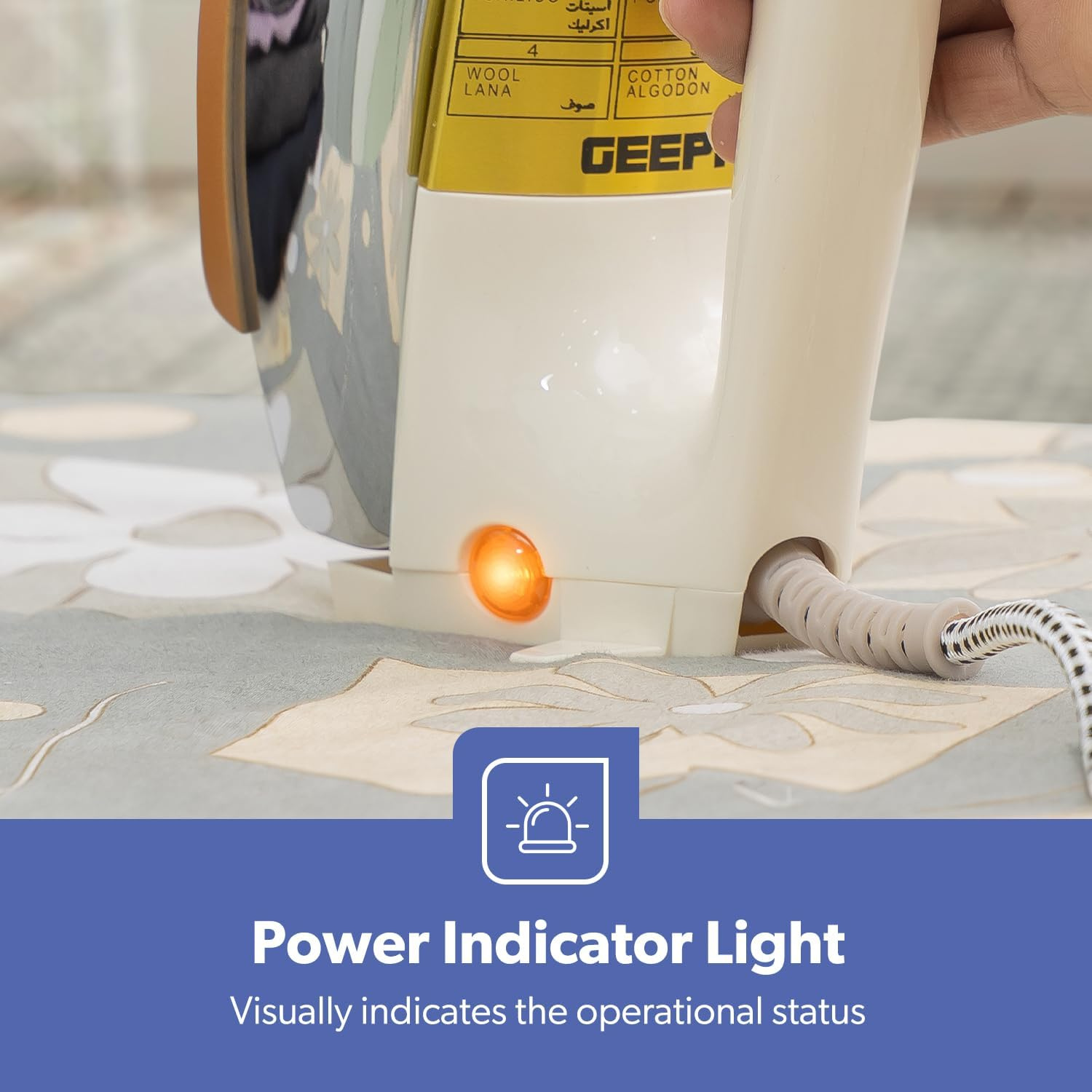 The Geepas Automatic Dry Iron GDI23011 offers superior ironing performance with a range of convenient features for easy and efficient ironing. Designed with a temperature settings dial and an auto shut-off function, this iron is ideal for all types of fabrics, ensuring the right heat for every garment. Its sleek white and golden design adds a touch of elegance to your ironing routine, you can trust it for long-lasting use.
