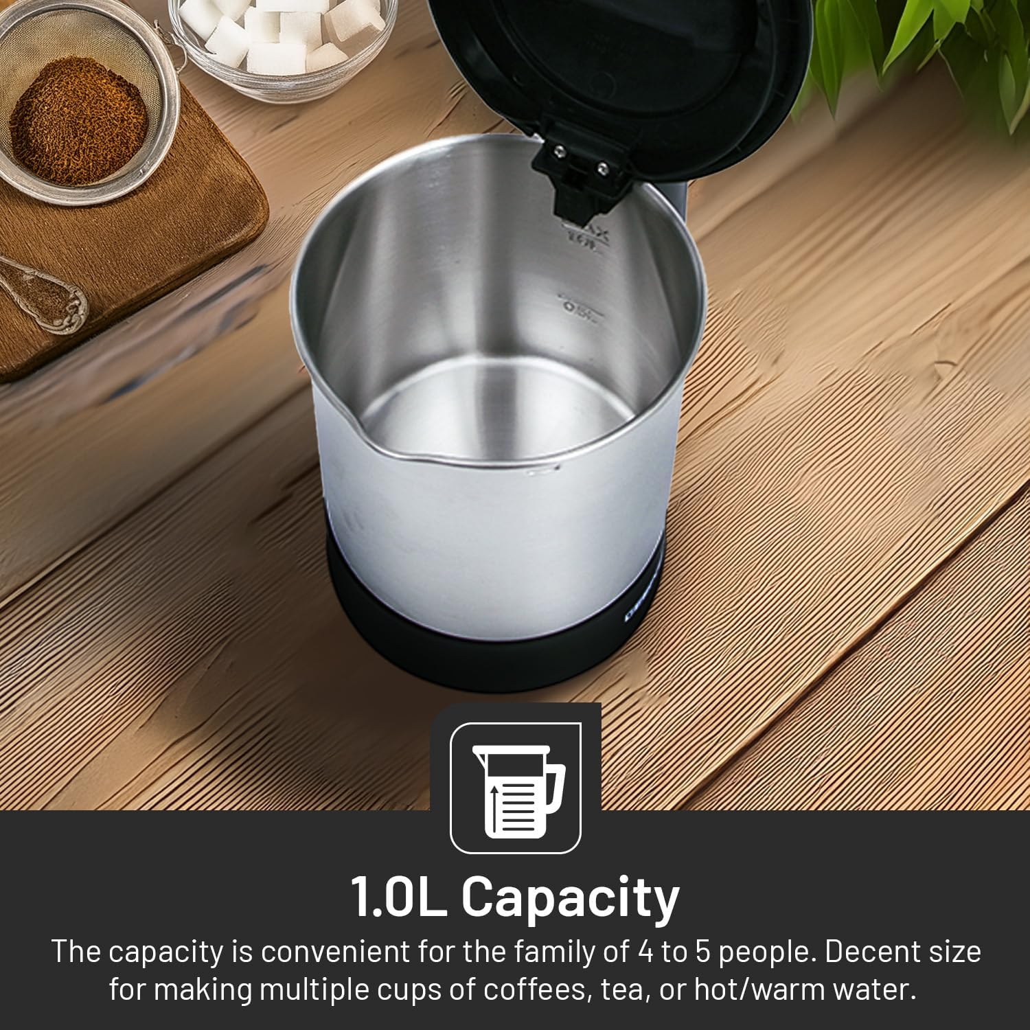 - 1.0L Capacity: Ideal for quick boiling of water for 1-2 servings, perfect for making tea, coffee, or instant meals.