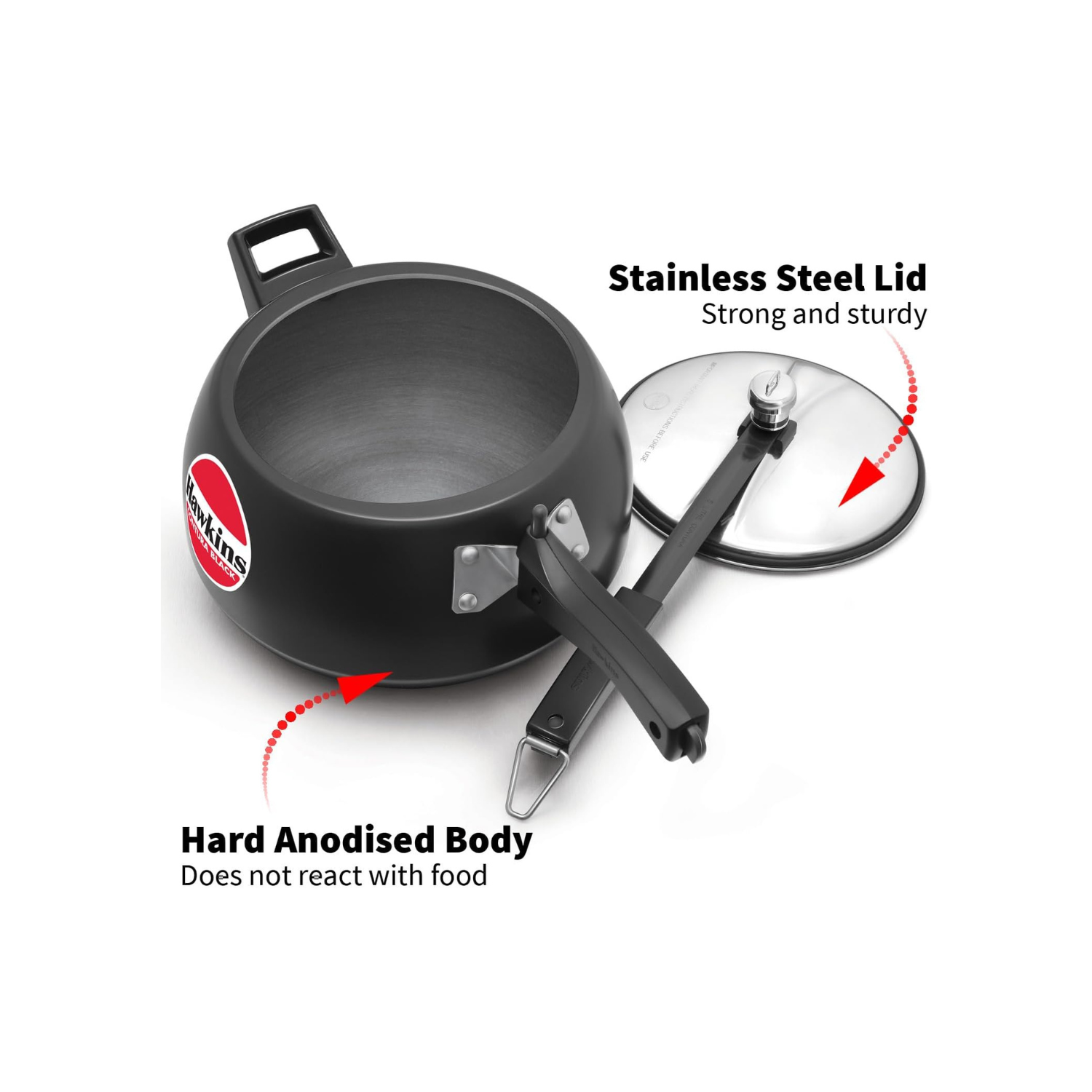 The Hawkins Contura Black 6.5 Litre Pressure Cooker (CB65) combines elegant design with superior performance to make everyday cooking faster, safer, and more convenient. Crafted with hard anodised aluminium, this inner-lid cooker ensures durability, even heating, and long-lasting beauty. The handi-shaped body design adds a touch of style to your kitchen while making it ideal for cooking large meals, biryanis, curries, or family feasts with ease.