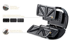 - 3-in-1 Functionality: Versatile design with sandwich, grill/griddle, and waffle plates for making a wide variety of dishes.