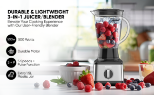 The Nikai 3-in-1 Blender (NB3900GEB) is a powerful and multifunctional kitchen appliance designed for all your blending, grinding, mixing, and juicing needs. With 500W power, it delivers consistent performance for various kitchen tasks, from smoothies to fine grinding. The blender comes with both glass and plastic jugs, offering flexibility and durability for different needs. The stainless steel blades ensure smooth and precise results every time. Equipped with 5 speed settings + pulse, you can adjust the blender’s power according to the task, making it perfect for both dry and wet ingredients. Whether you’re grinding spices, making smoothies, or juicing fruits, this versatile blender is a must-have in every kitchen.
