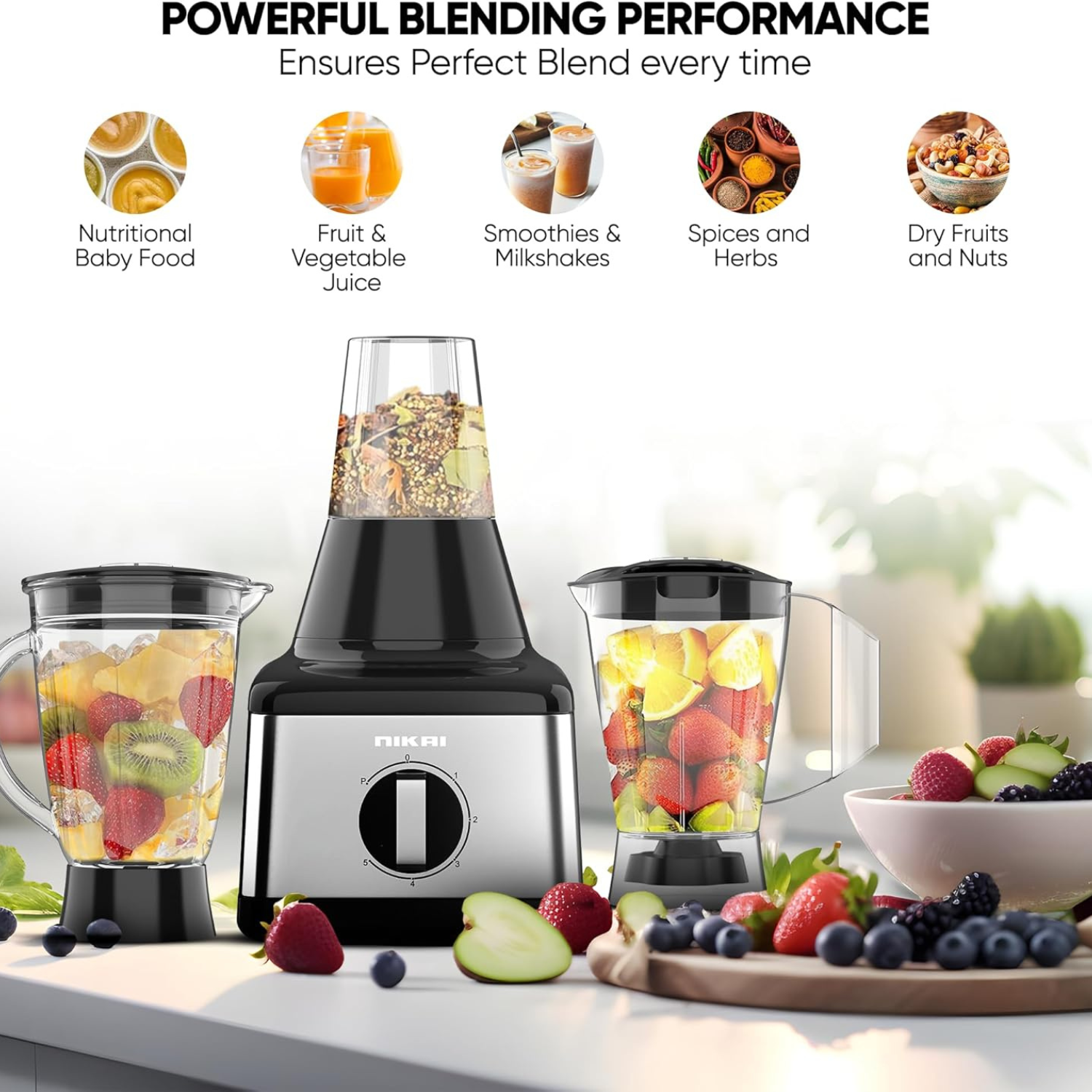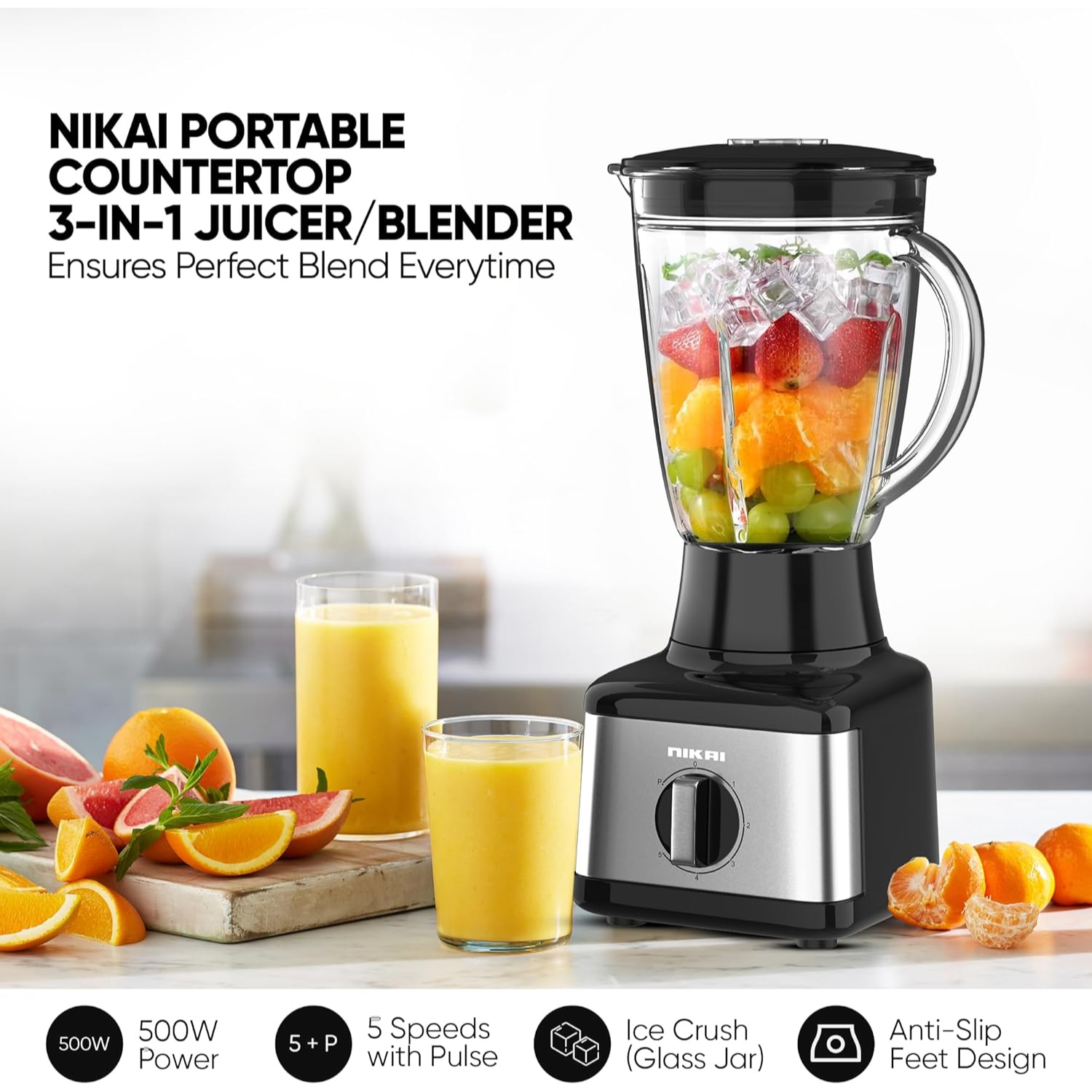 The Nikai 3-in-1 Blender (NB3900GEB) is a powerful and multifunctional kitchen appliance designed for all your blending, grinding, mixing, and juicing needs. With 500W power, it delivers consistent performance for various kitchen tasks, from smoothies to fine grinding. The blender comes with both glass and plastic jugs, offering flexibility and durability for different needs. The stainless steel blades ensure smooth and precise results every time. Equipped with 5 speed settings + pulse, you can adjust the blender’s power according to the task, making it perfect for both dry and wet ingredients. Whether you’re grinding spices, making smoothies, or juicing fruits, this versatile blender is a must-have in every kitchen.