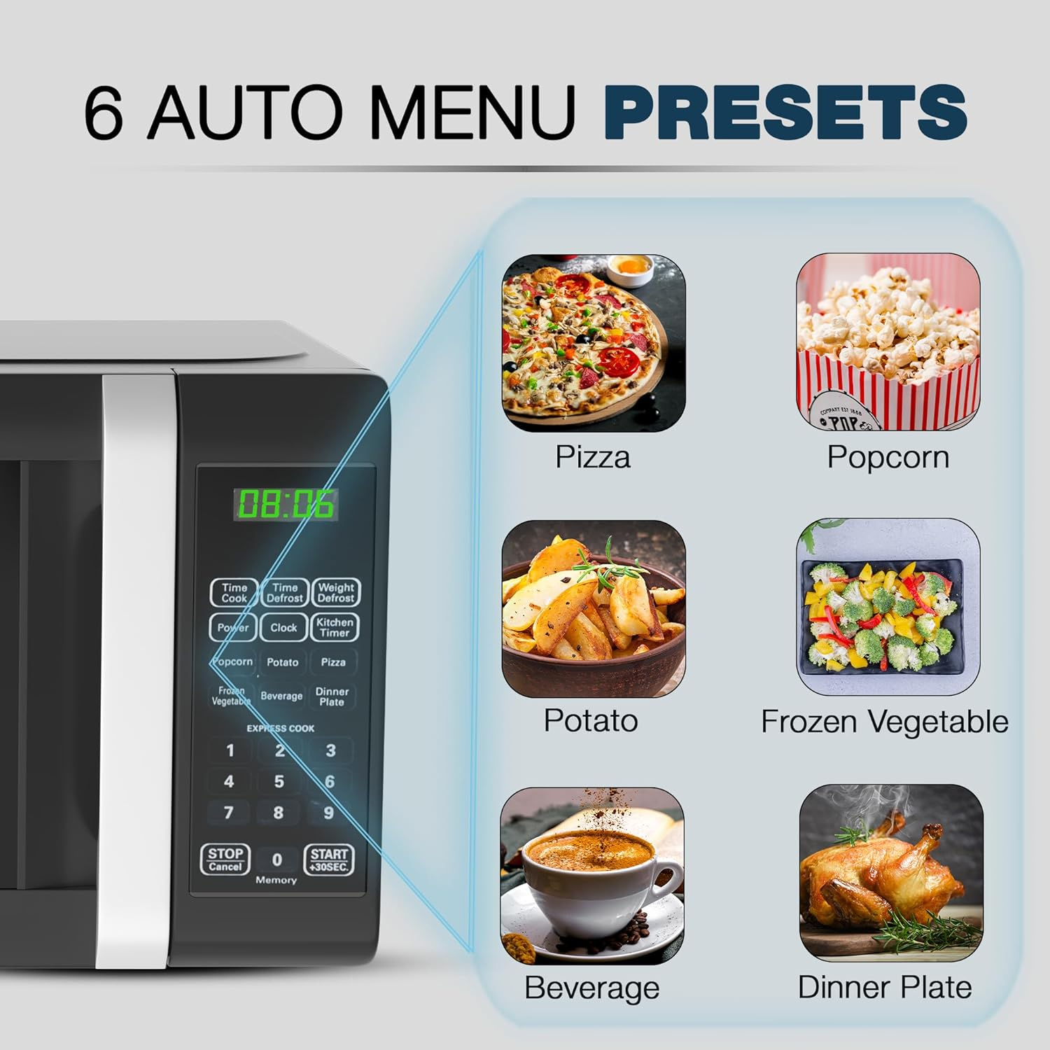 6 Auto Menus: Pre-programmed settings for commonly cooked dishes like popcorn, pizza, and more, ensuring convenient one-touch cooking.