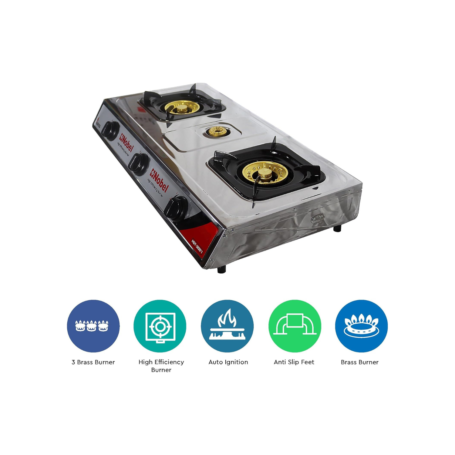 The Nobel 3 Gas Burner Gas Stove, NGT3007, offers a high-performance cooking experience with its three brass burners and sleek cold steel paint finish. Equipped with a piezo ignition system for easy, match-free lighting, this stove provides consistent and reliable heat distribution. With a combination of single and double brass covers, it is built for durability and efficiency, making it a perfect addition to any kitchen.
