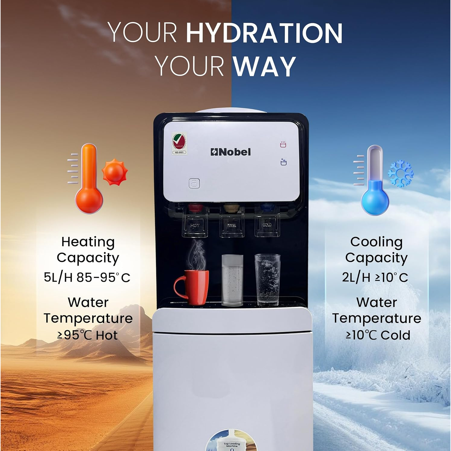 The Nobel 3-Tap Water Dispenser (NWD1700) is a versatile, freestanding unit that provides convenient access to hot, normal, and cold water, catering to all your hydration needs. With its modern design, the dispenser is equipped with R134a compressor cooling, ensuring efficient and fast cooling of water. The storage cabinet at the bottom adds extra convenience, allowing you to store cups, water bottles, or other items. Perfect for homes, offices, or pantries, the Nobel 3-Tap Water Dispenser combines functionality, style, and safety in one compact unit.