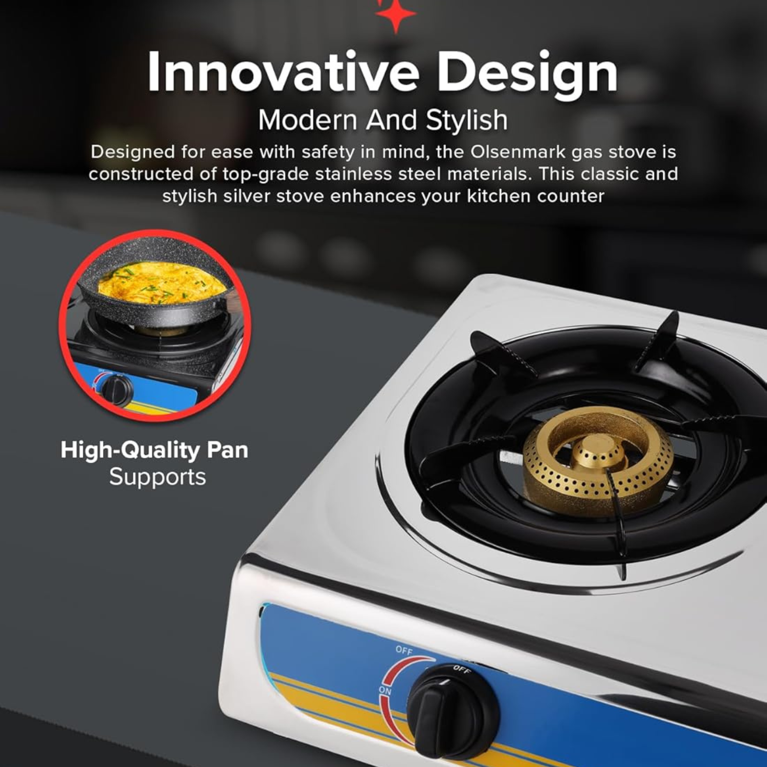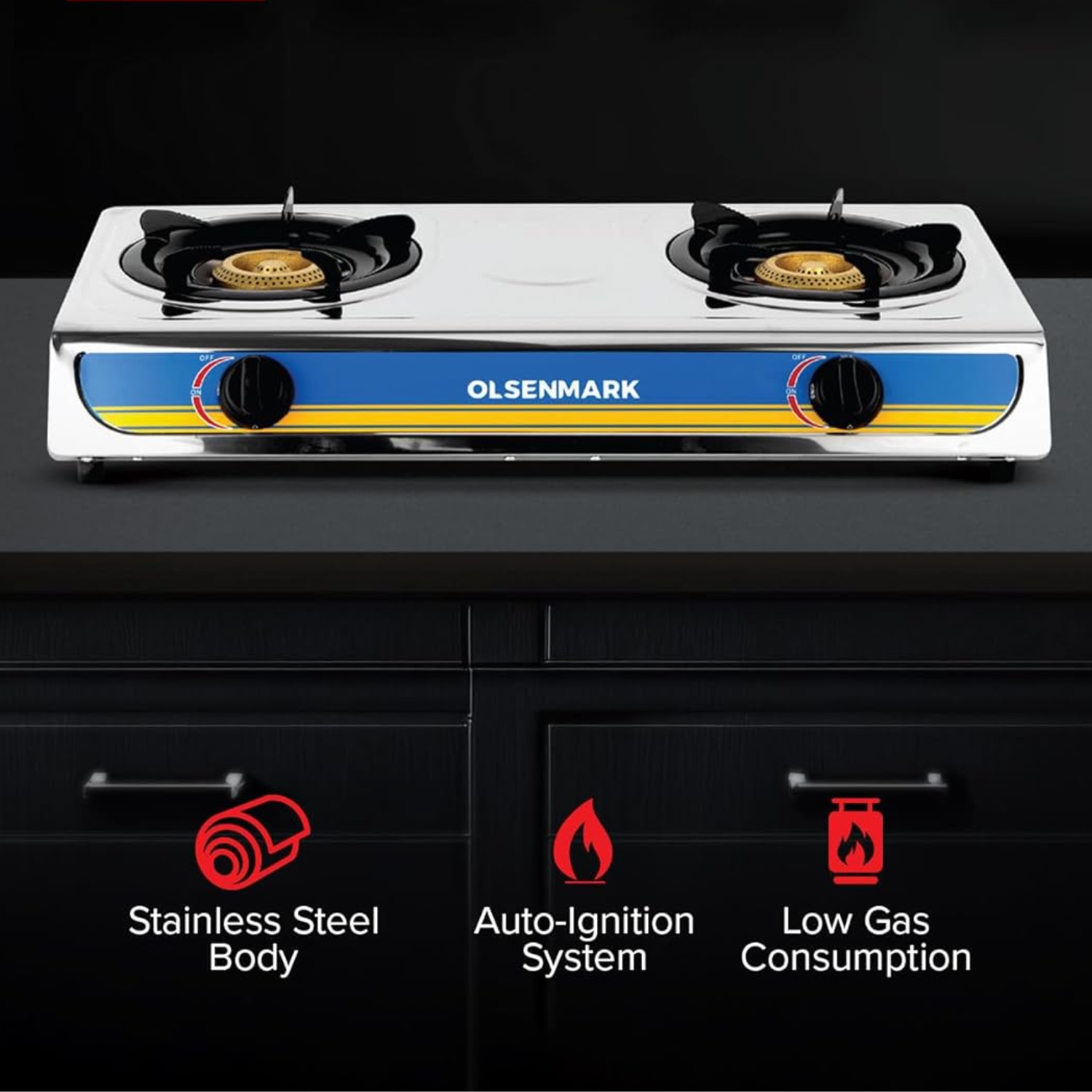 The Olsenmark Stainless Steel Double Burner Gas Stove combines modern functionality with reliable performance, making it an excellent choice for everyday cooking. Designed with durable materials and practical features, it ensures safe, efficient, and hassle-free cooking for your kitchen.