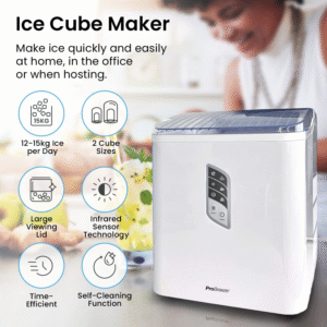 The Pro Breeze Ice Maker Machine is the perfect addition to your home, kitchen, bar, or party setup. This compact yet powerful unit can produce up to 15kg of ice daily, ensuring you always have a fresh supply of clear bullet ice. With two ice sizes to choose from, it delivers ice in just 6-9 minutes, making it fast and convenient for any occasion. The self-cleaning function ensures easy maintenance, while the included ice scoop adds extra convenience. Whether you need ice for beverages, parties, or everyday use, this machine is efficient, user-friendly, and sleek in design.