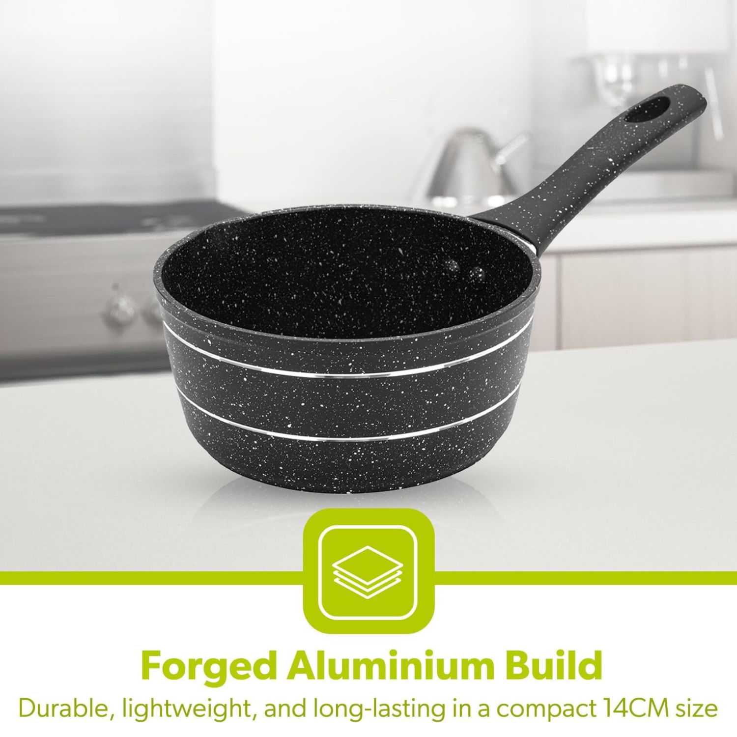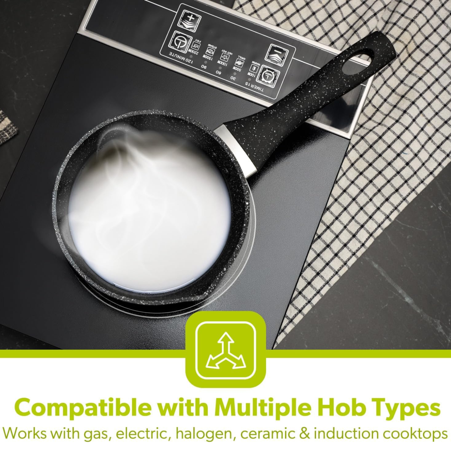 The Royalford 16cm Milk Pan (RF11833) is a versatile and essential cookware piece for every modern kitchen. Designed with a durable non-stick granite coating, this multipurpose saucepan ensures easy cooking with minimal oil and effortless cleaning. Its induction-compatible base provides quick and even heat distribution, making it suitable for all stovetop types. The thoughtfully designed pour spout allows smooth and mess-free pouring, perfect for milk, soups, sauces, or reheating small portions. Combined with an ergonomic heat-resistant handle and stylish black granite finish, this milk pan is both functional and aesthetically pleasing.