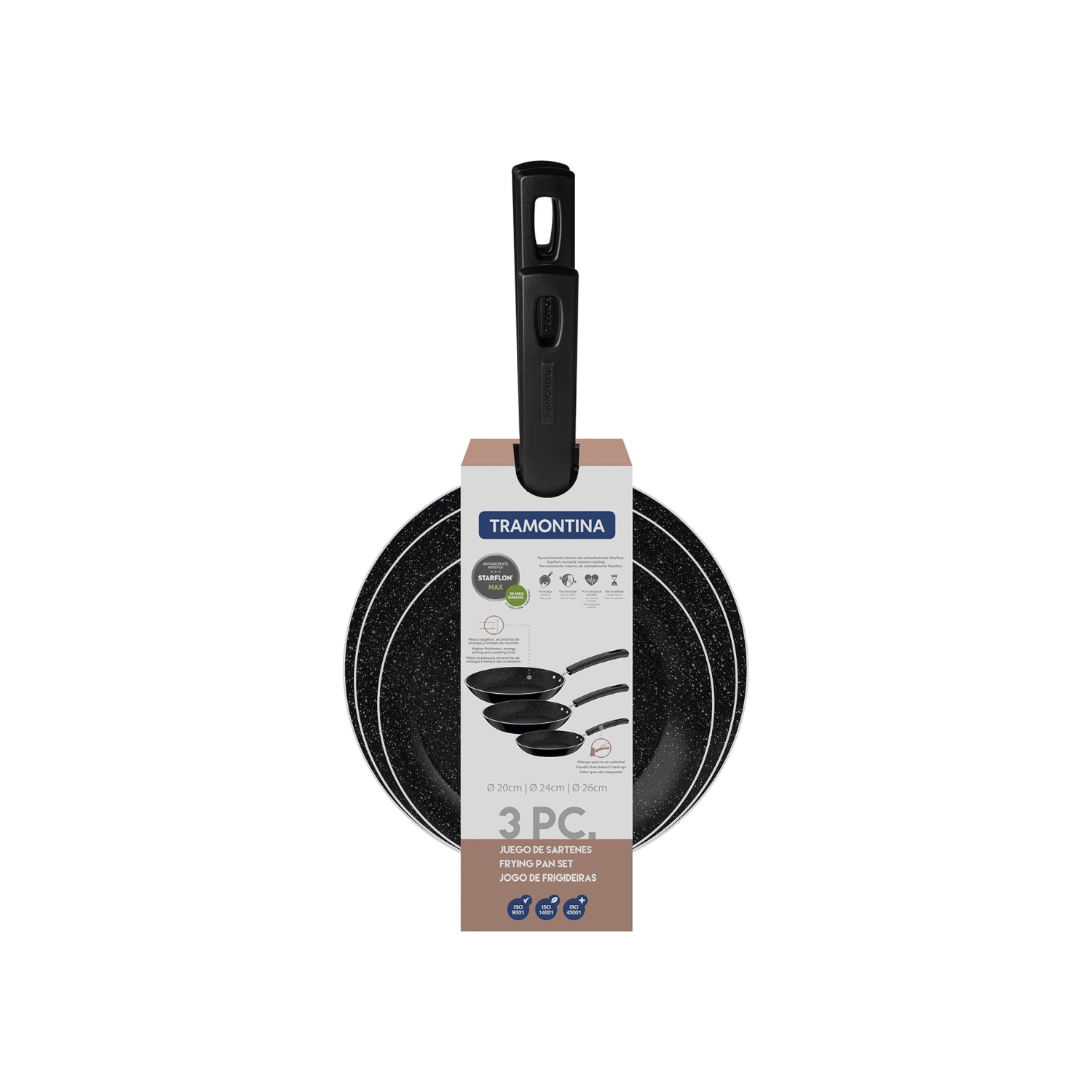 Cook efficiently and healthily with the Tramontina Chelsea 3-Piece Frying Pan Set, featuring premium aluminum construction, PFOA-free Starflon Max nonstick coating, and versatile sizes (20 cm, 24 cm, 26 cm) for all your frying, sautéing, and searing needs. Perfect for everyday cooking, this set combines durability, style, and convenience.
